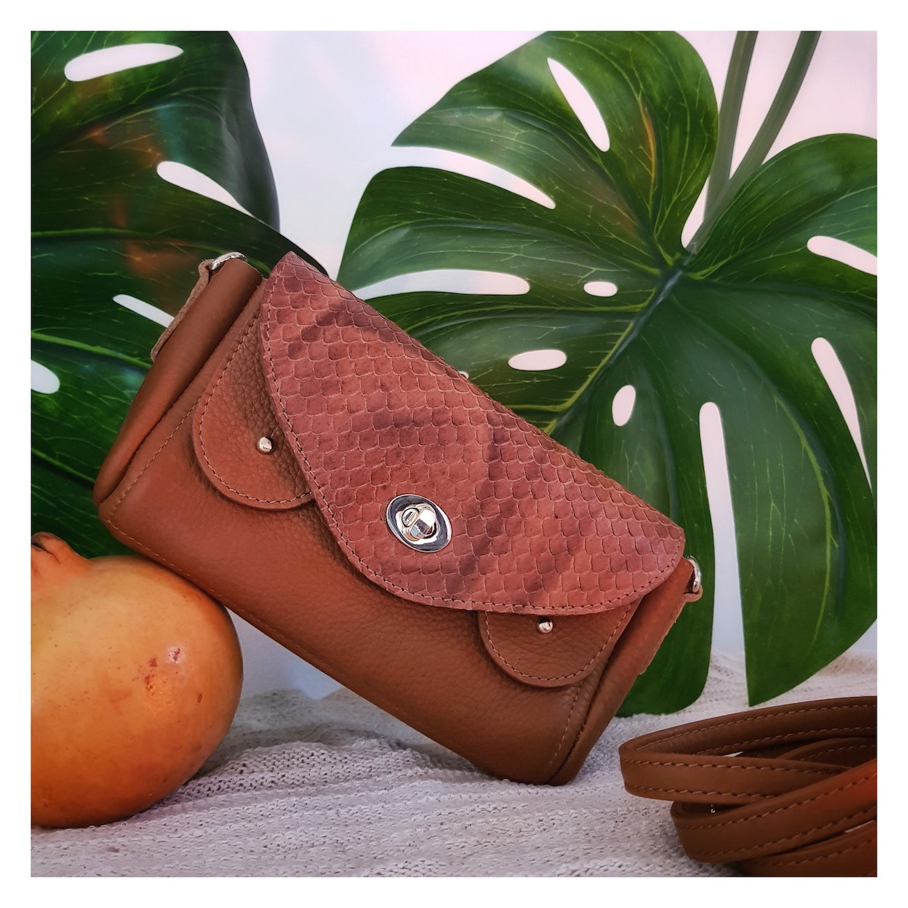 Top flap leather with scales nuanced in brown tones and embossed scales, under flap and body of the bag in full-grain brown grained cowhide leather; the leather will patina beautifully over time.