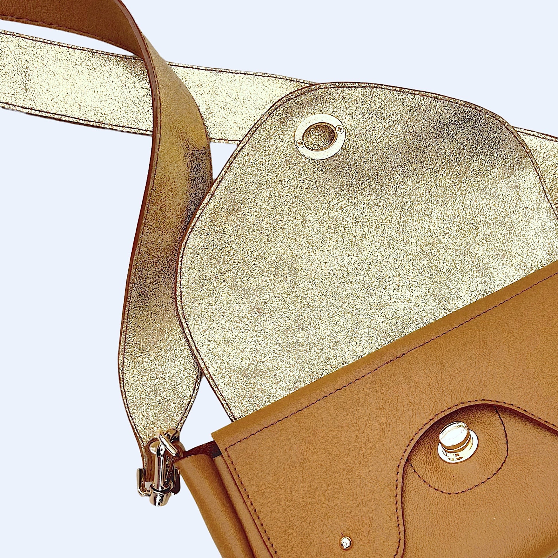 The bag is made with a matching wide leather strap, lined with light gold leather.