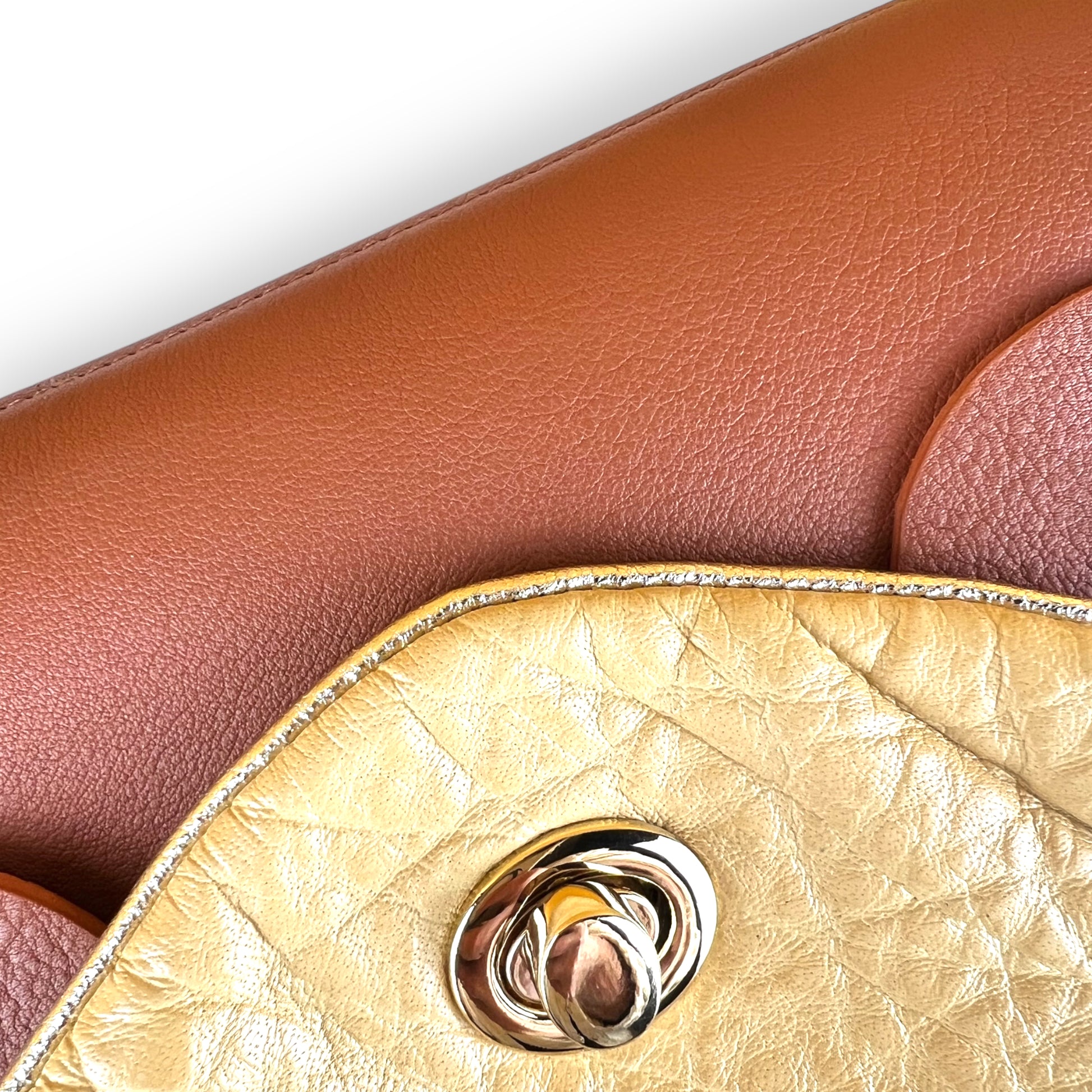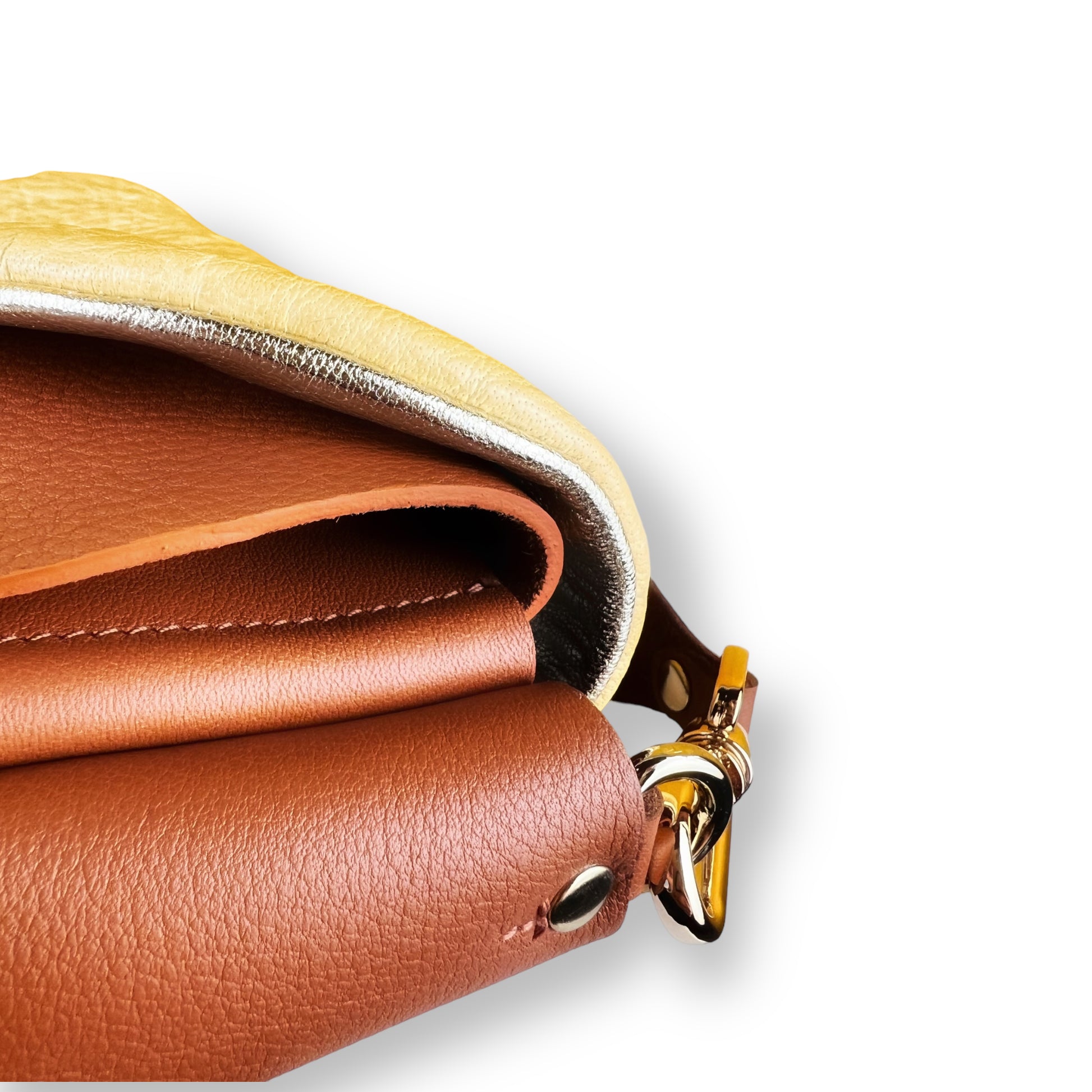 • Thick and supple top flap with crinkled and soft pale yellow grain, reverse stitching with back of the flap in metallic champagne-colored leather.