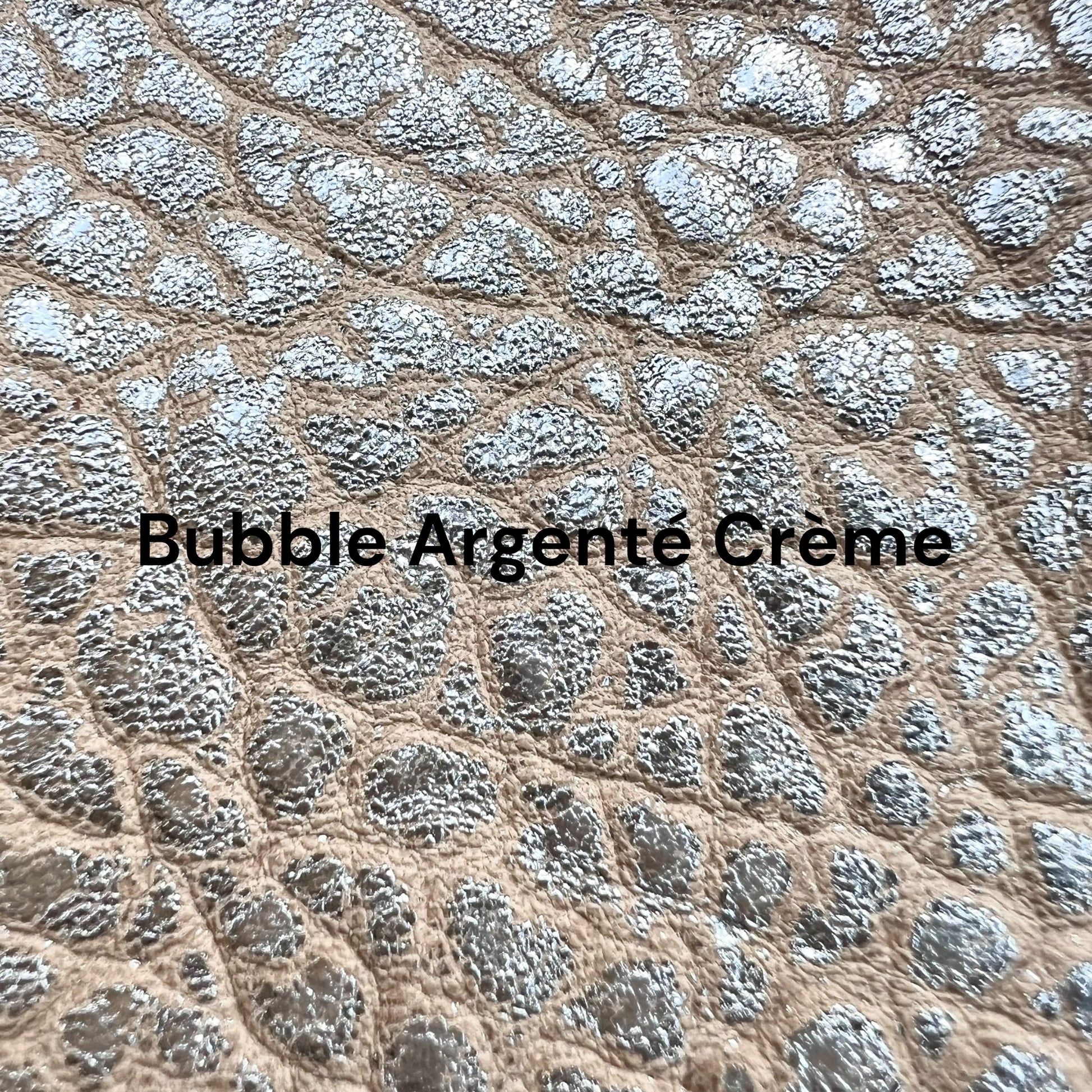 Un cuir souple et d'aspect bullé, moelleux, finition argenté clair brillante sur fond beige-crème.