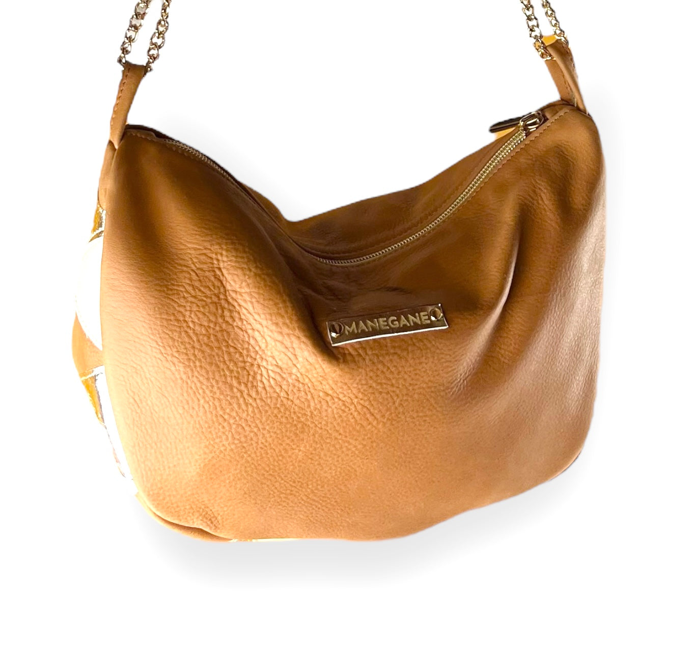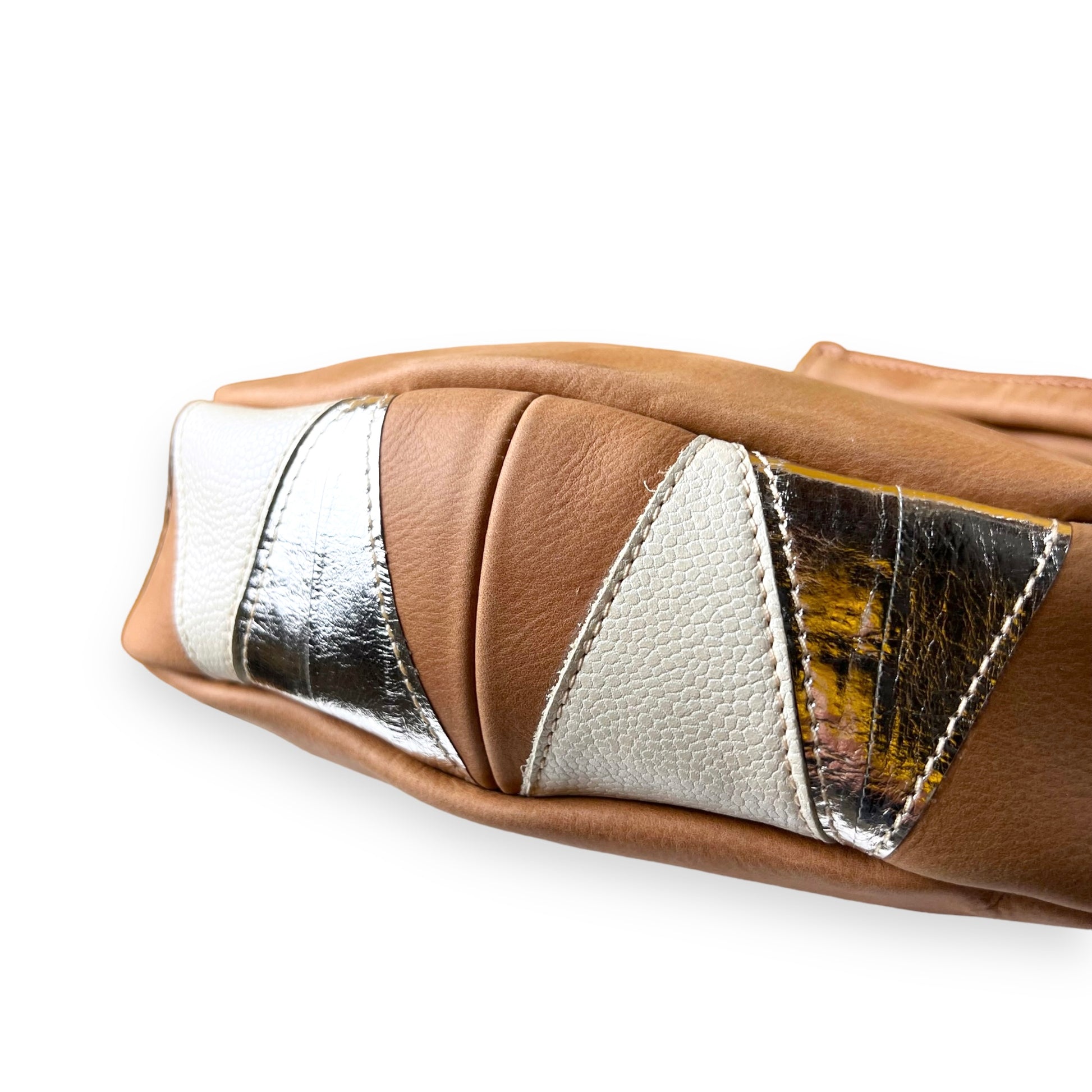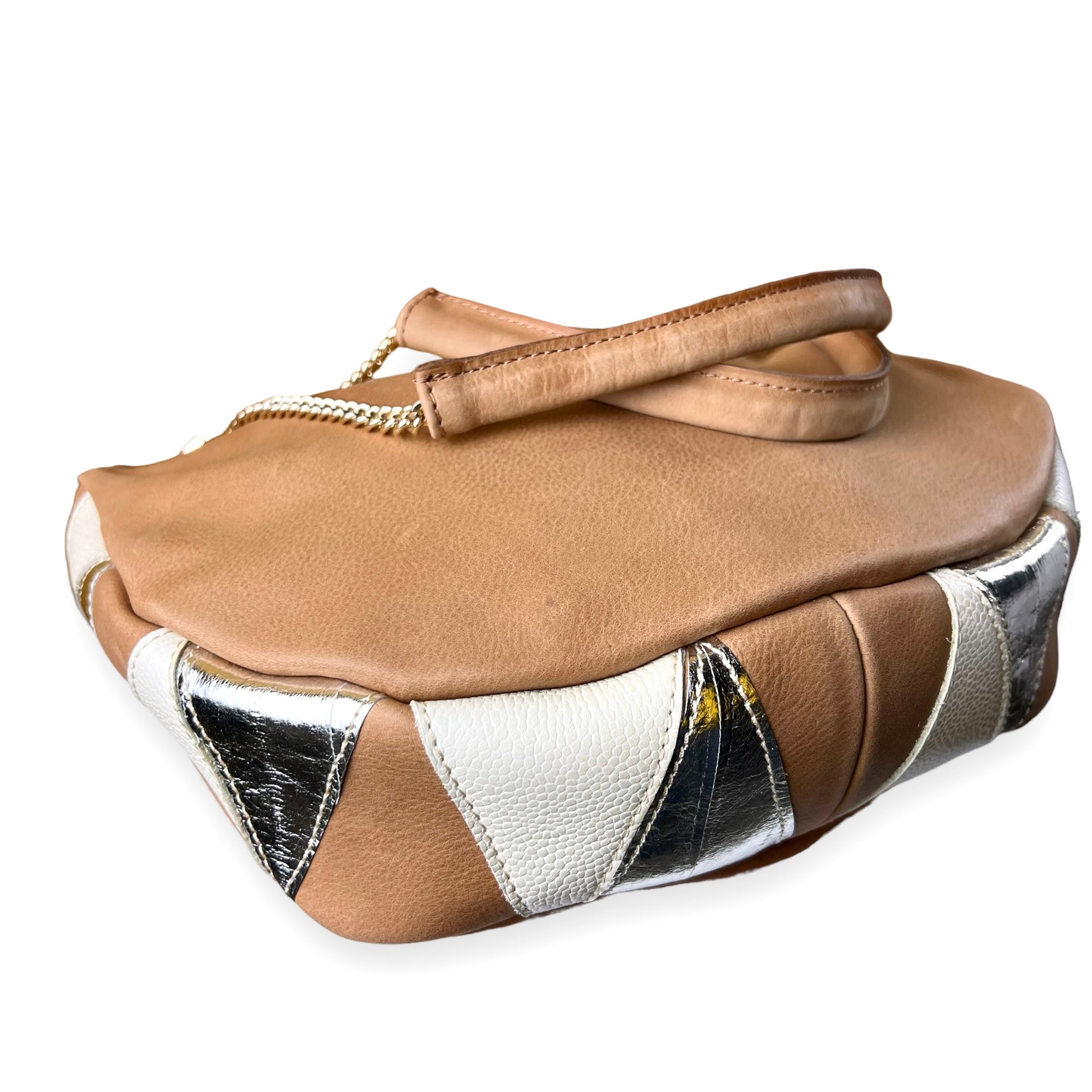 Trabajo de cuero estilo patchwork por todas partes. Conjunto de triángulos de piel dorada clara, granulada blanca y caramelo, alrededor del bolso.