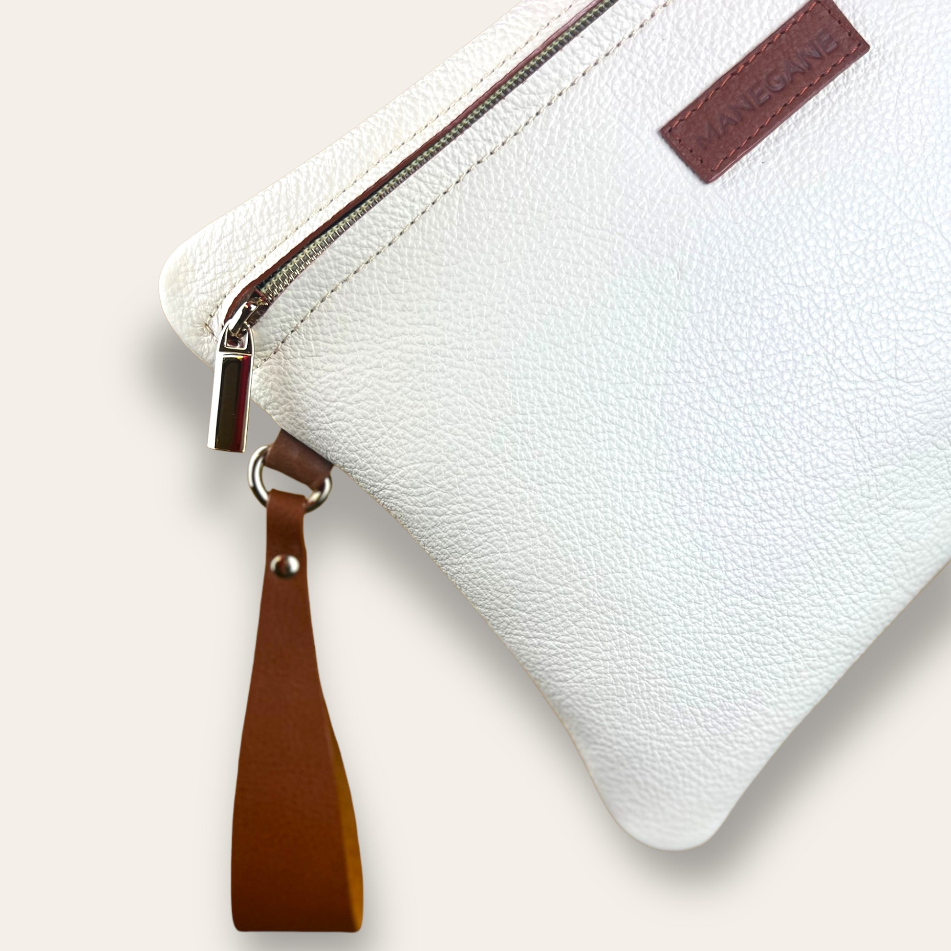 Bolso de piel en un color único, con su pulsera y su diseño refinado, destaca por su elegancia y flexibilidad irresistible.