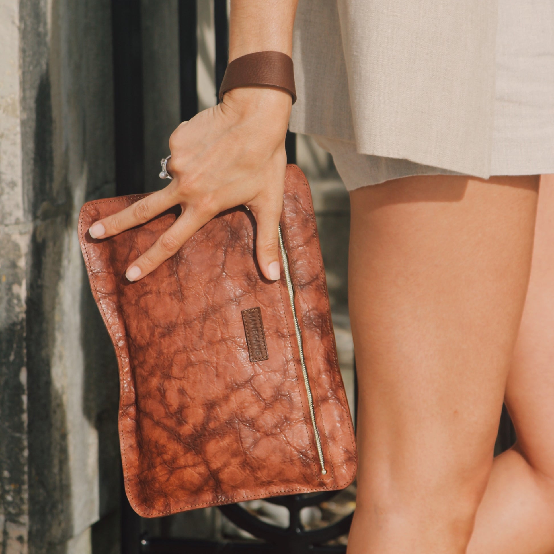 Piel de cabra jaspeada lisa y suave con efecto vintage. Montaje con bordes sin rematar, teñido de marrón y barnizado.