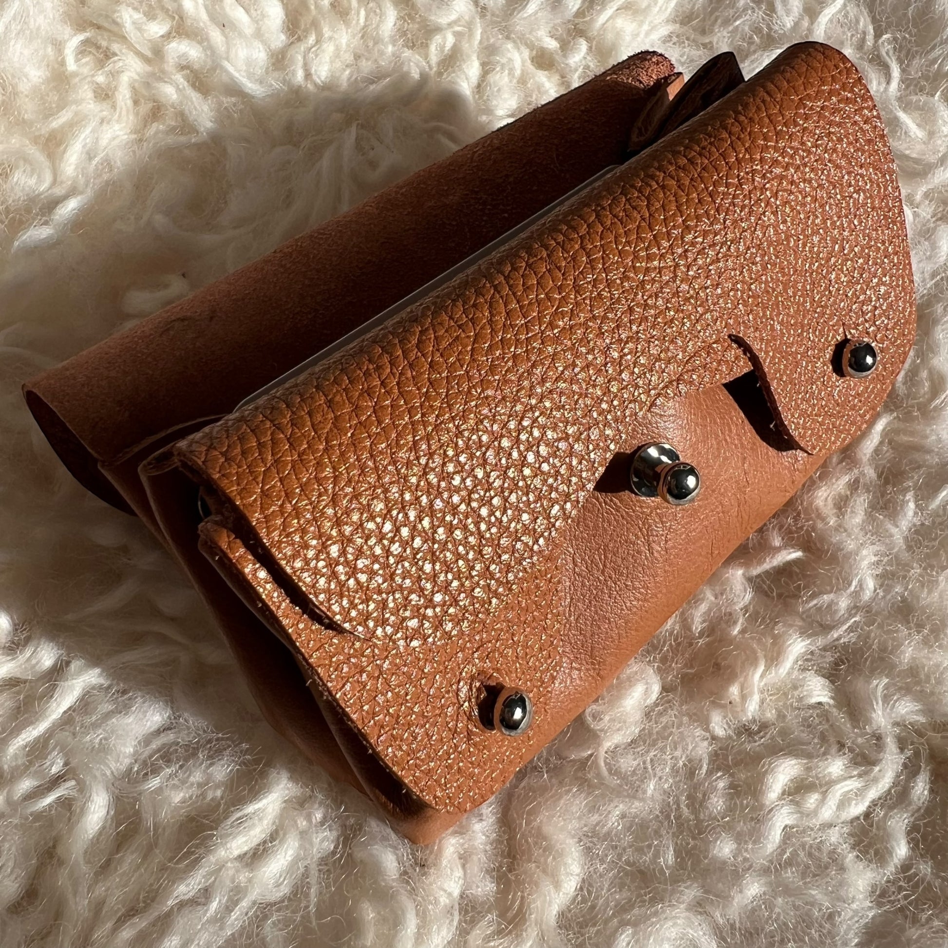 • Accesorio diseñado íntegramente en nuestro taller de Biarritz.• Colores dorado y caramelo, forro de cuero en la solapa inferior y costuras tono sobre tono