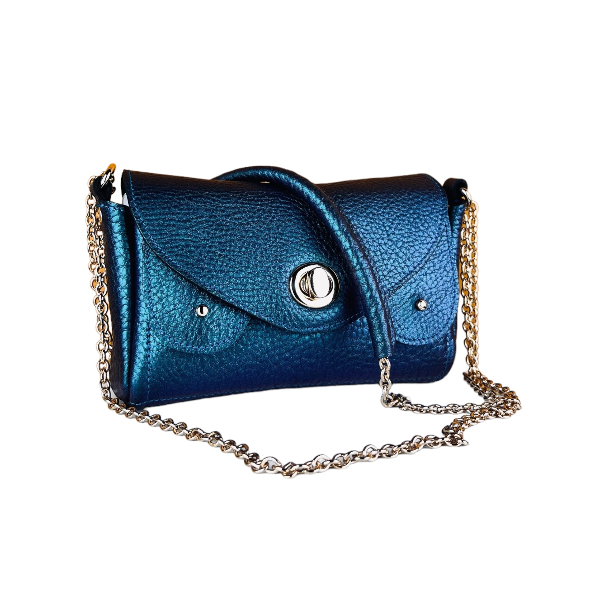 • Ensemble du sac travaillé dans un cuir métallisé, épais et souple de couleur bleu azur aux reflets subtils indigo selon l' éclairage. L'ensemble est surpiqué de fil ton sur ton.