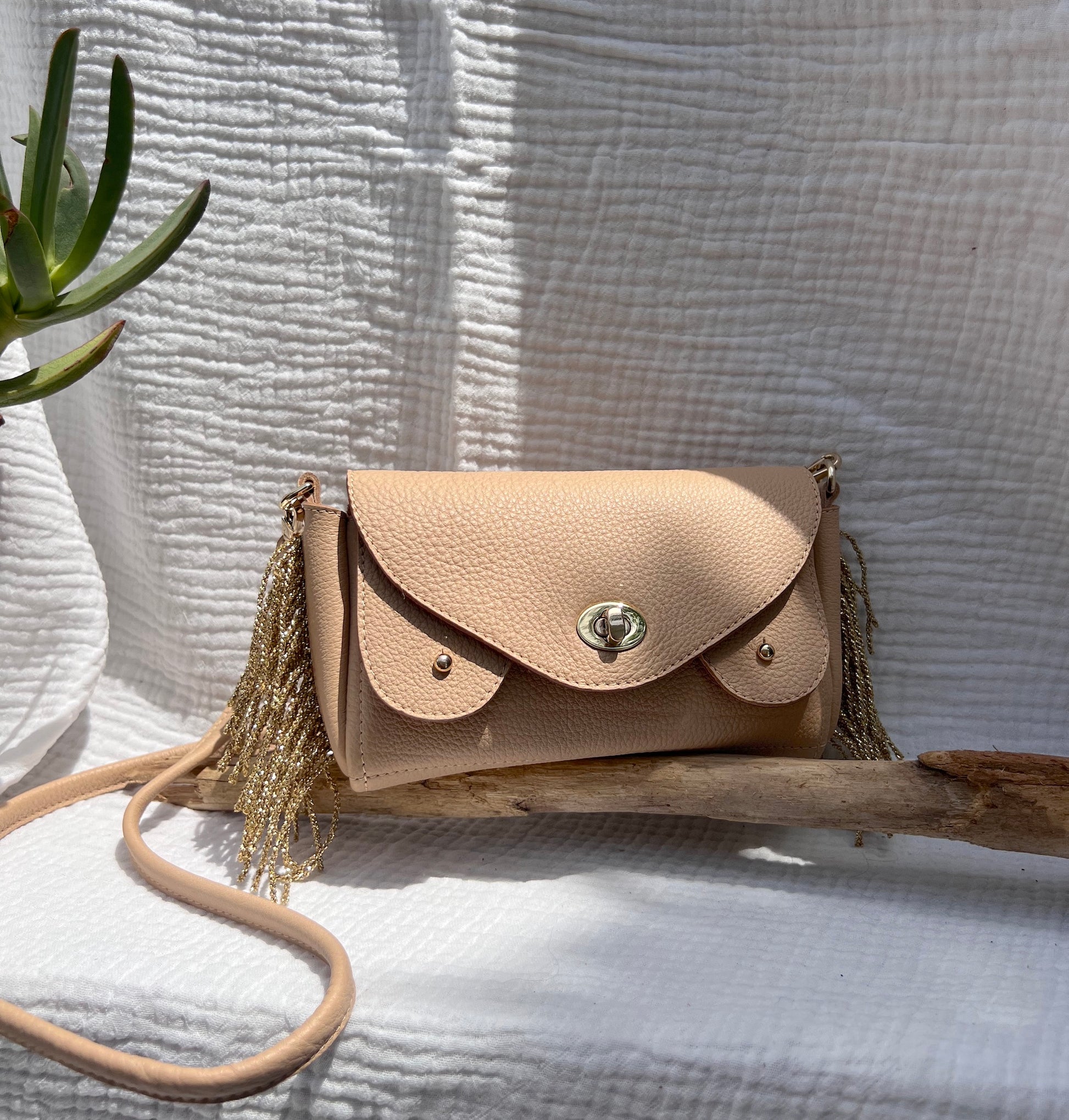 Réalisé artisanalement à Biarritz, le Bisou Bag Mini Dune avec franges est un sac double fonction, puisqu’il peut être porté épaule ou à la ceinture.