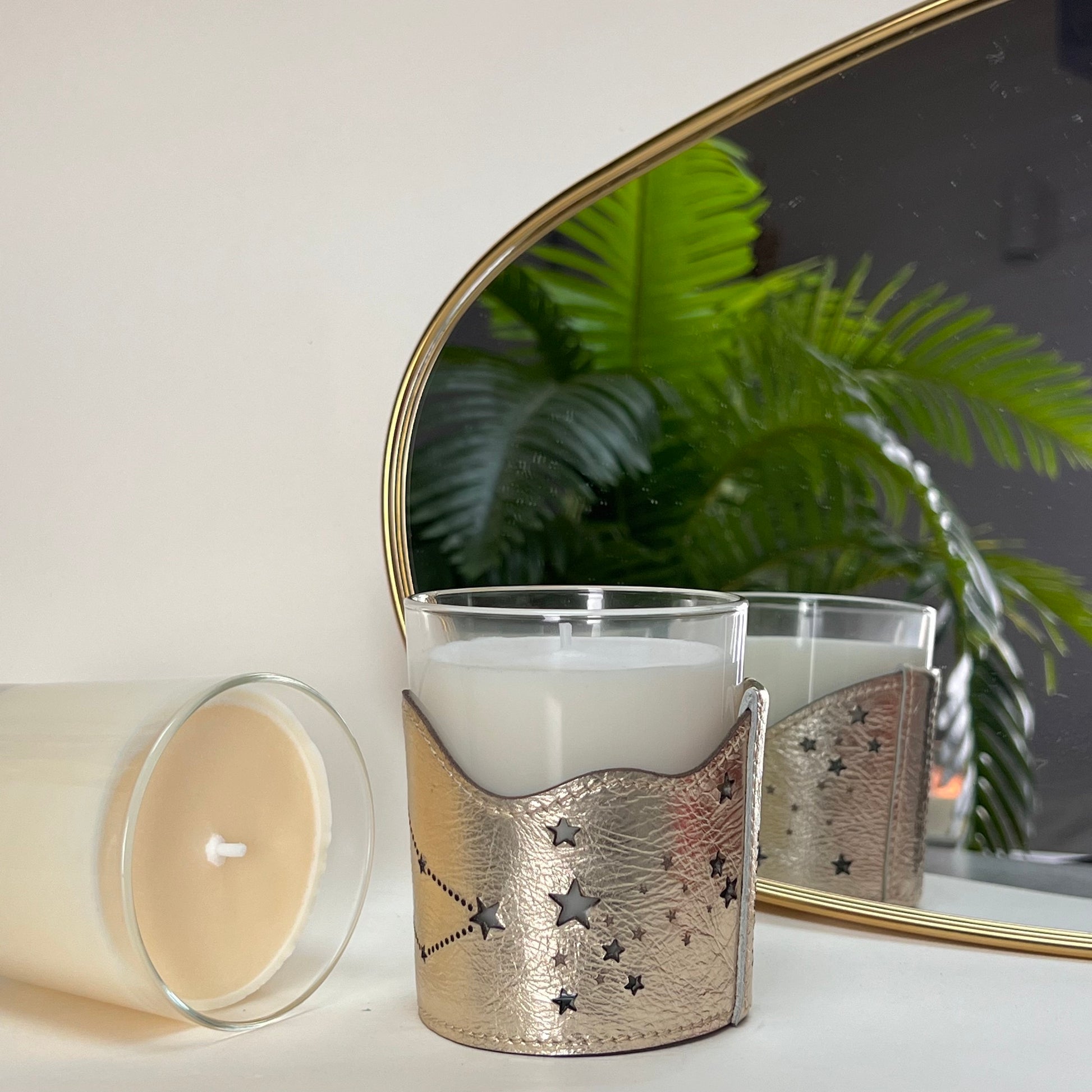 "Découvrez notre collection exclusive de 12 bougies Astrologie, représentant votre constellation, enveloppées dans un étui en cuir doré gravé des 12 constellations du zodiaque.