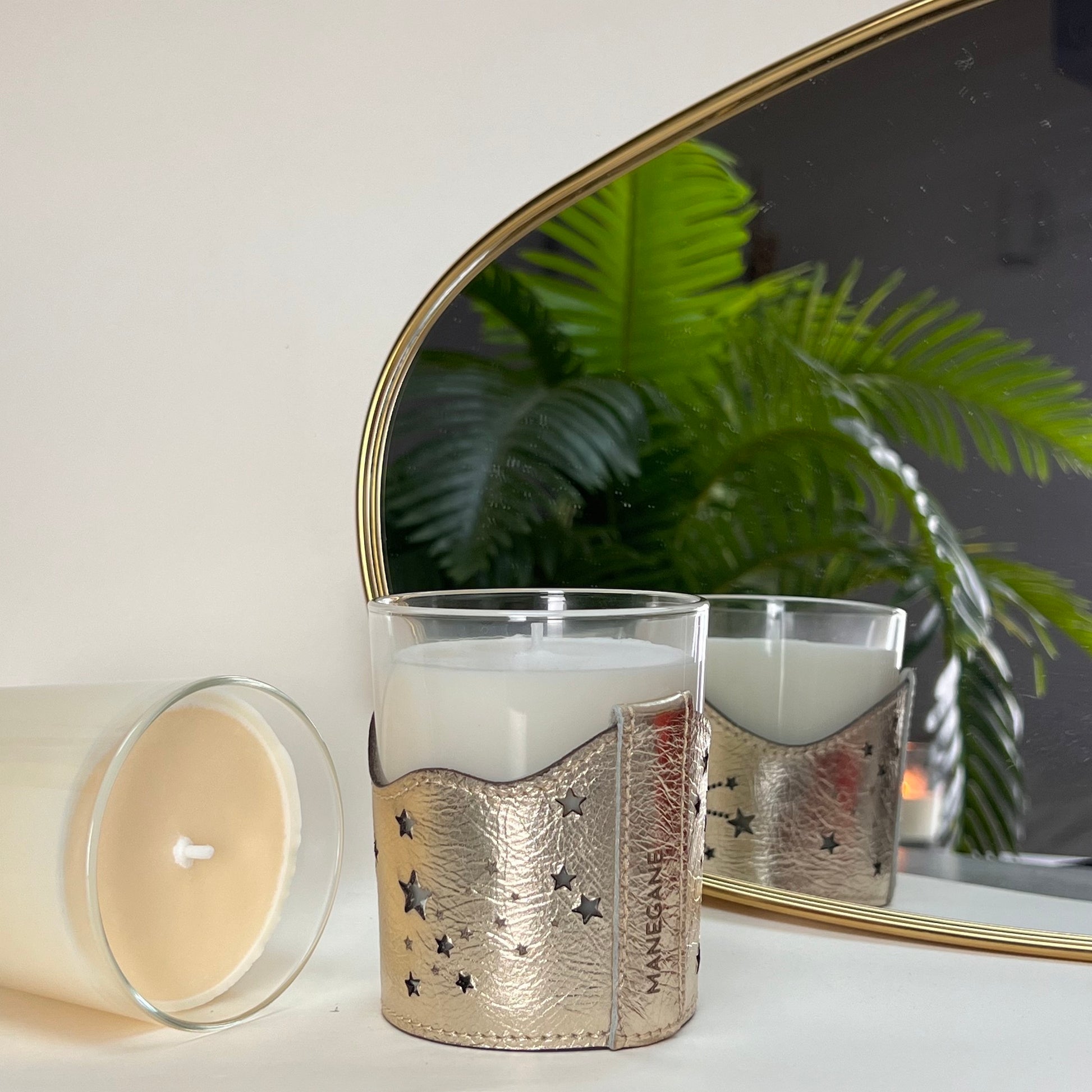 Bougie de 180 grammes. 47 heures de brûlage. Couleur du cuir doré clair métallisé.