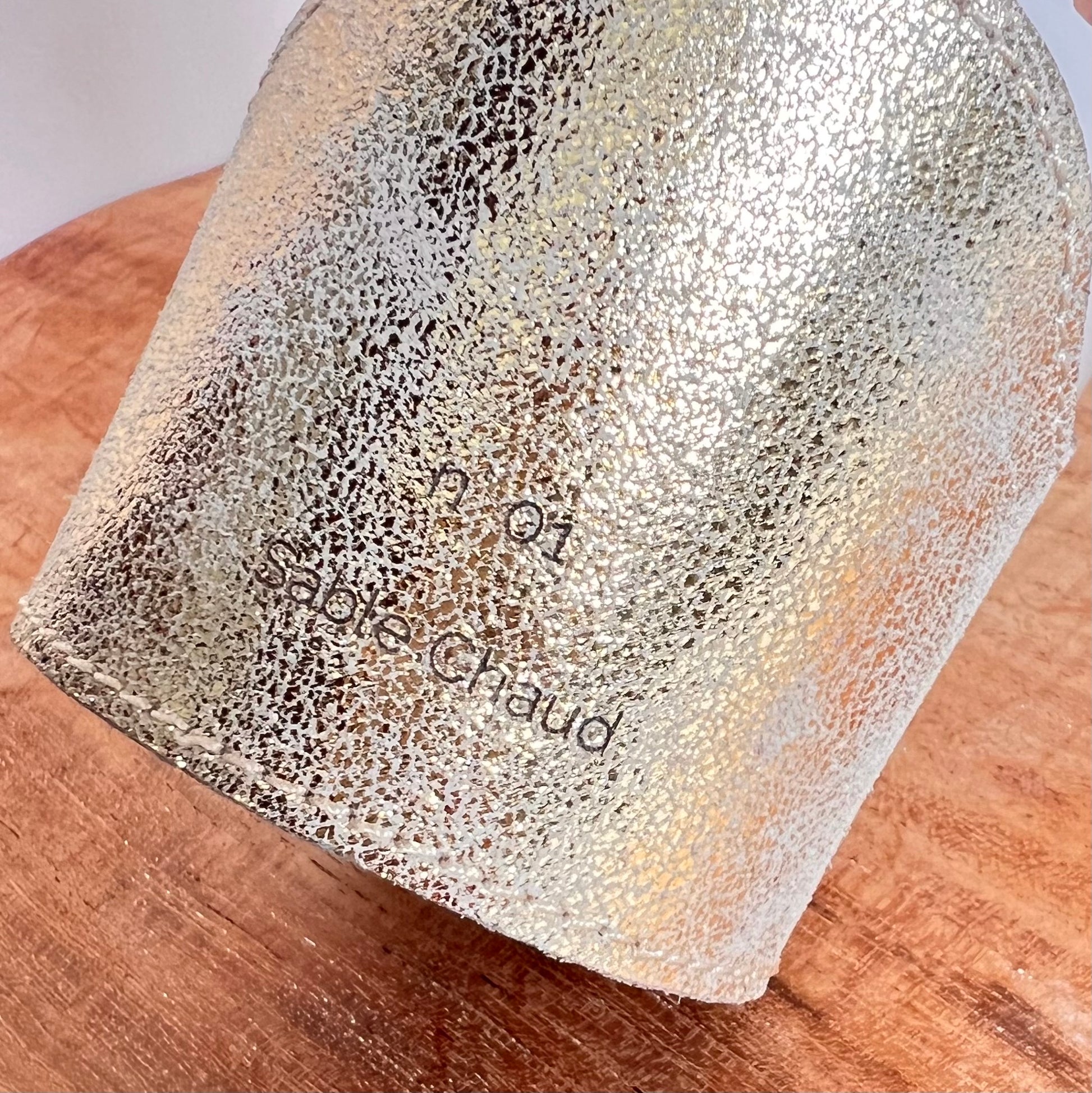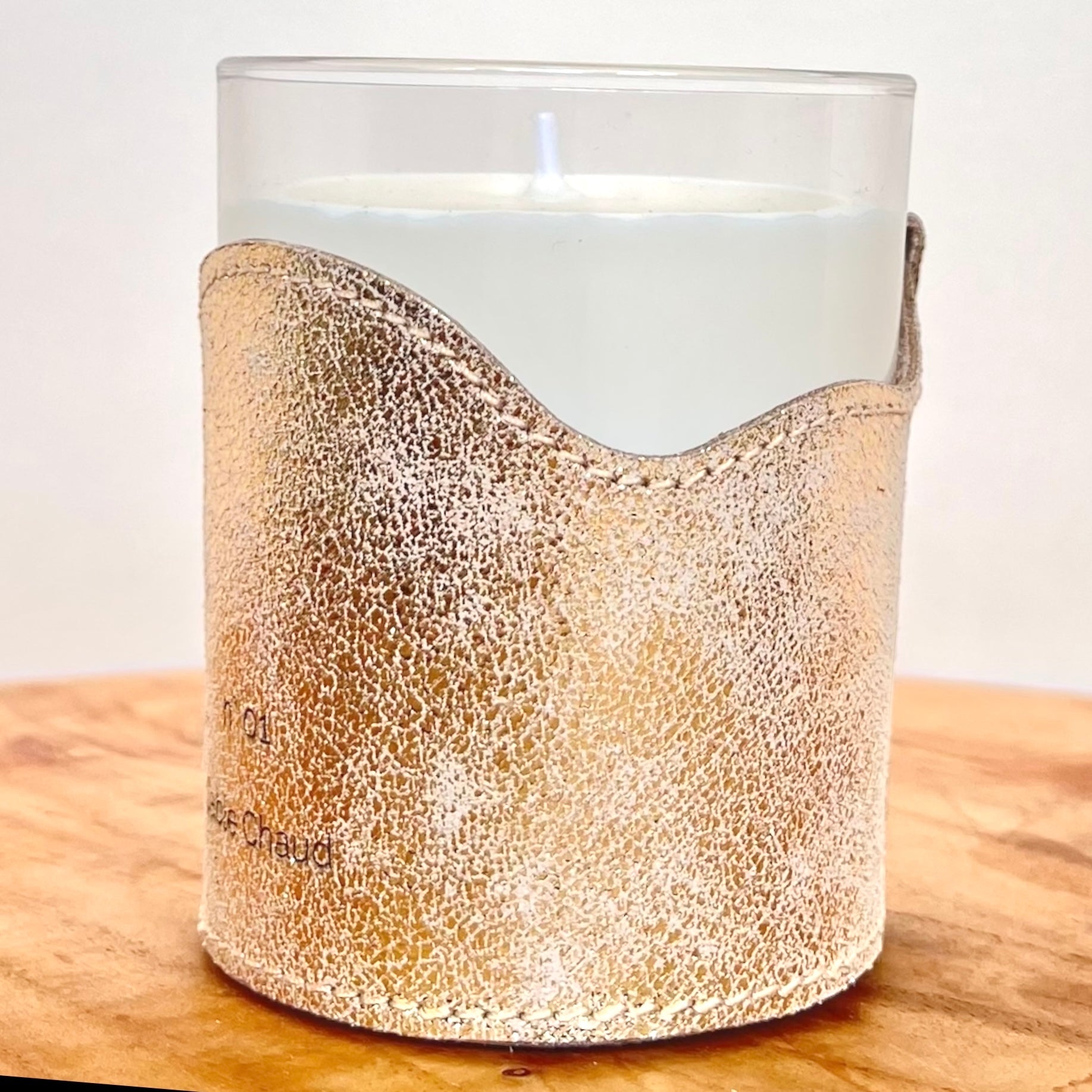 Bougie de 180 grammes. 47 heures de brûlage. Couleur du cuir Light Gold métallisé.