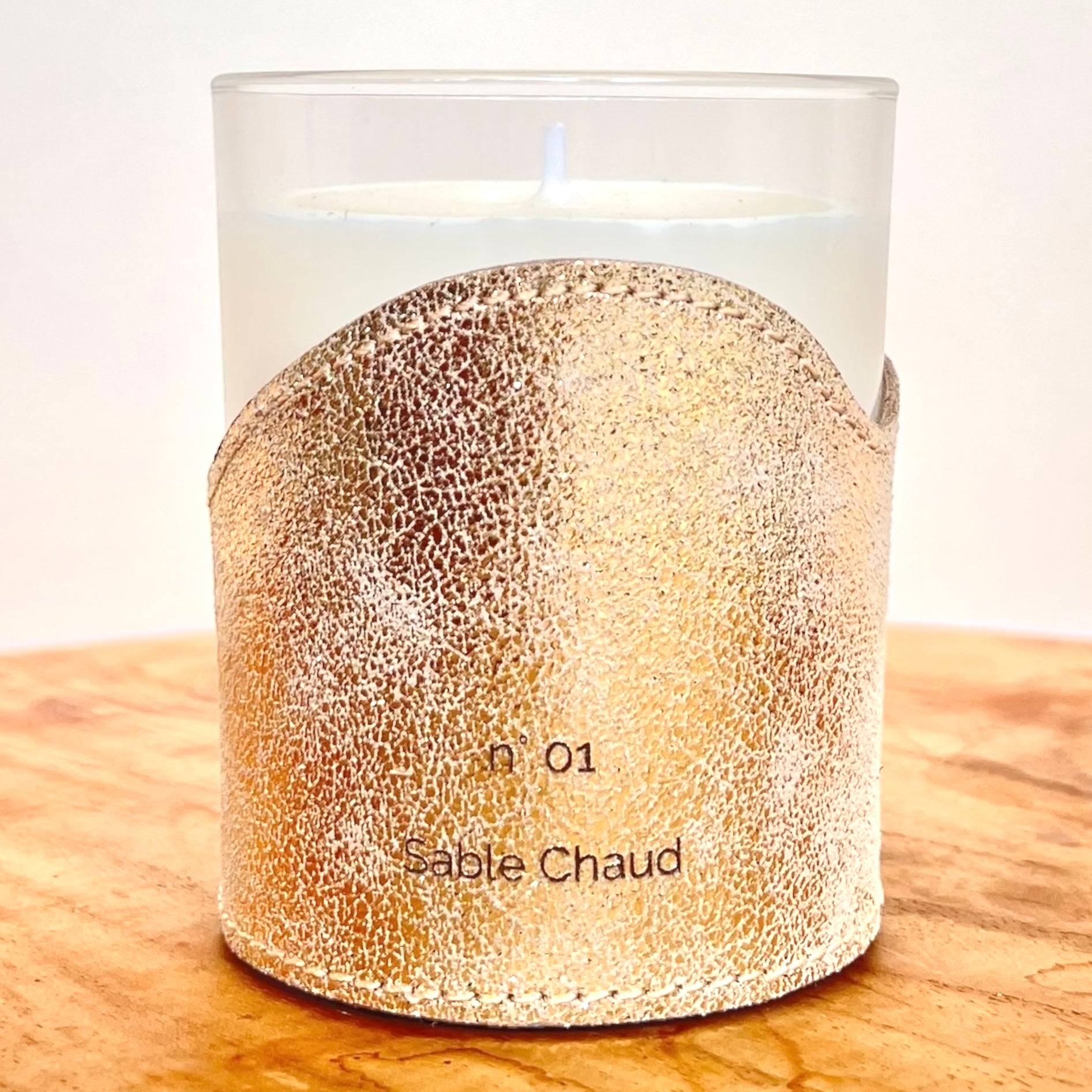 BOUGIE DANS SON ÉTUI DE CUIR Rechargeable - N°01 SABLE CHAUD