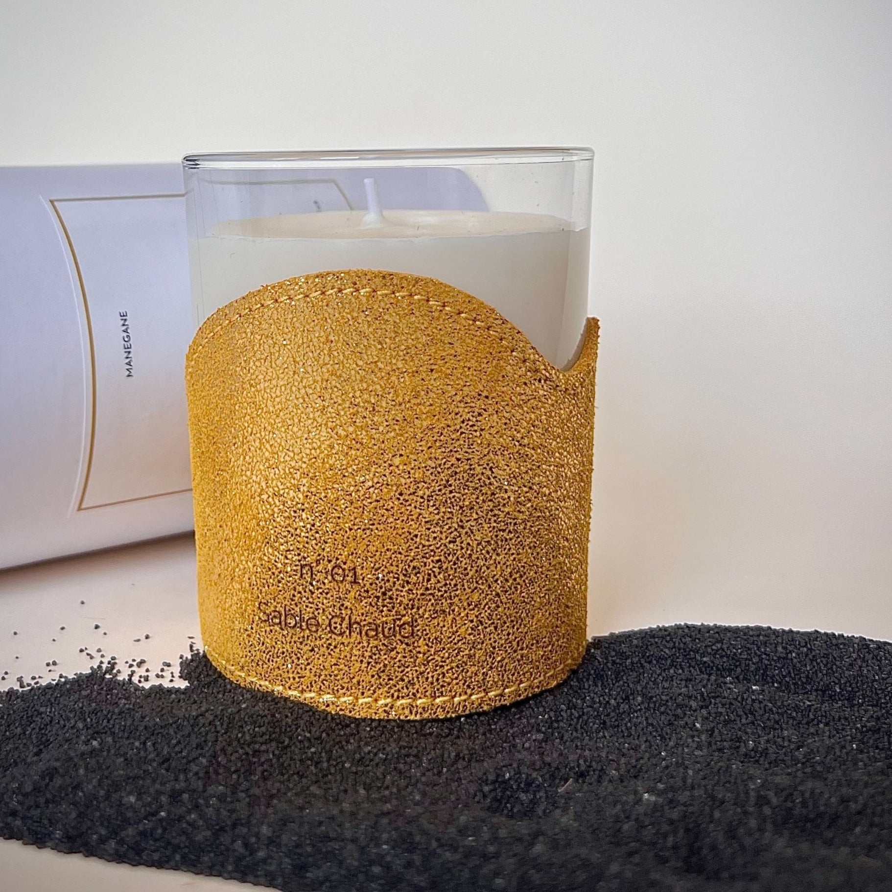 Basés en Nouvelle-Aquitaine, ces bougies sont le fruit de la collaboration entre un artisan cirier passionné qui perpétue la tradition de la fabrication de bougies à la casserole et le savoir-faire en maroquinerie de Manegane.
