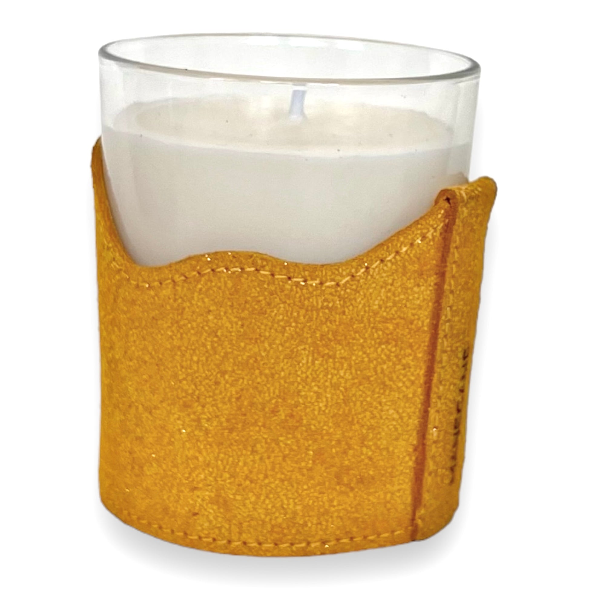 Bougie de 180 grammes. 47 heures de brûlage. Couleur du cuir Jaune métallisé.