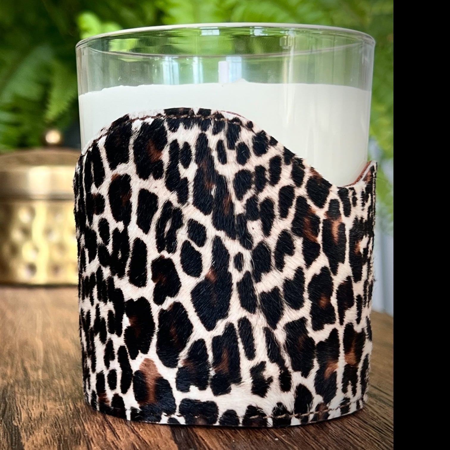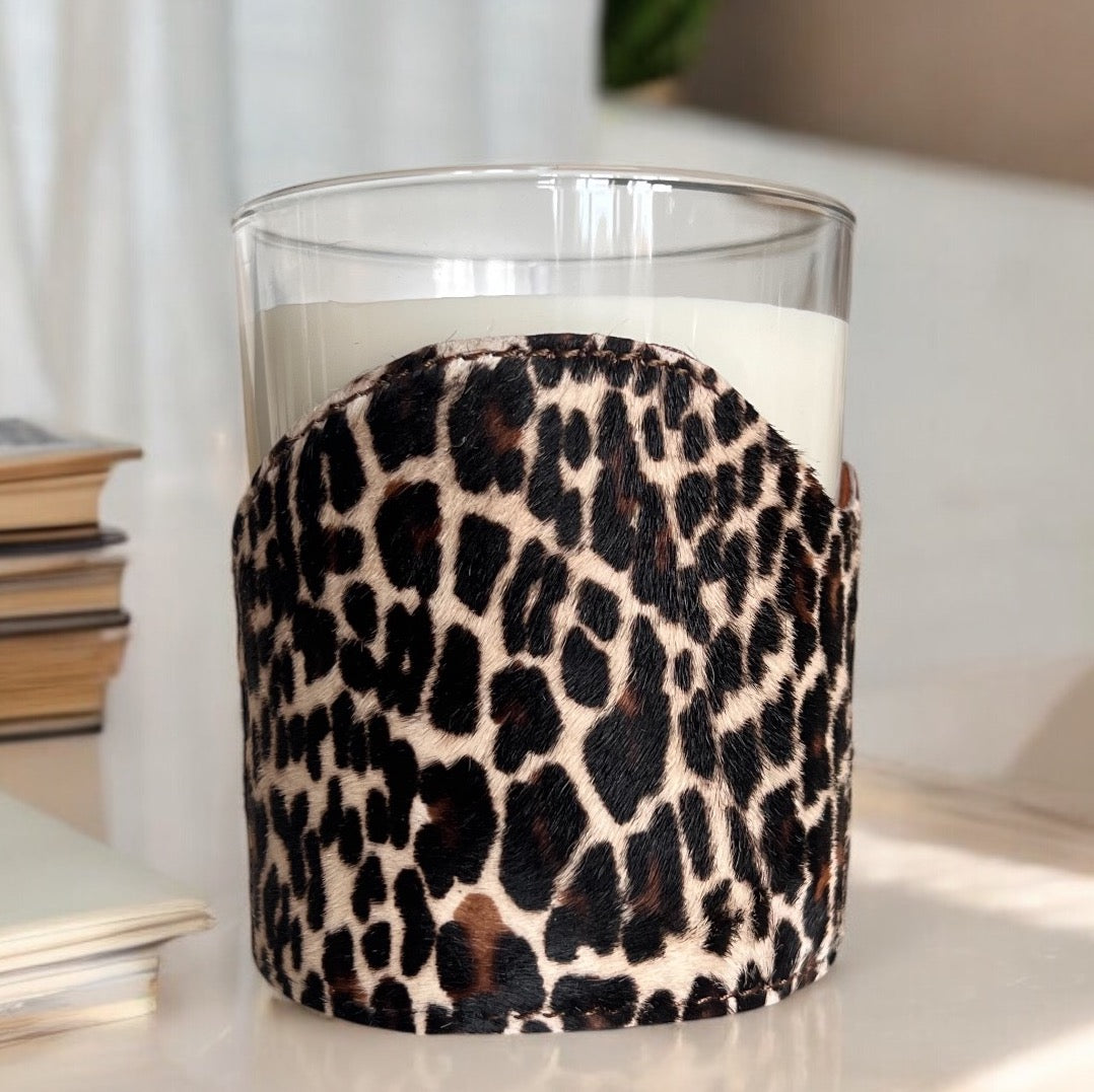 Découvrez notre bougie parfumée végétale gainée dans son étui de cuir façon pony imprimé léopard, plus vrai que nature!