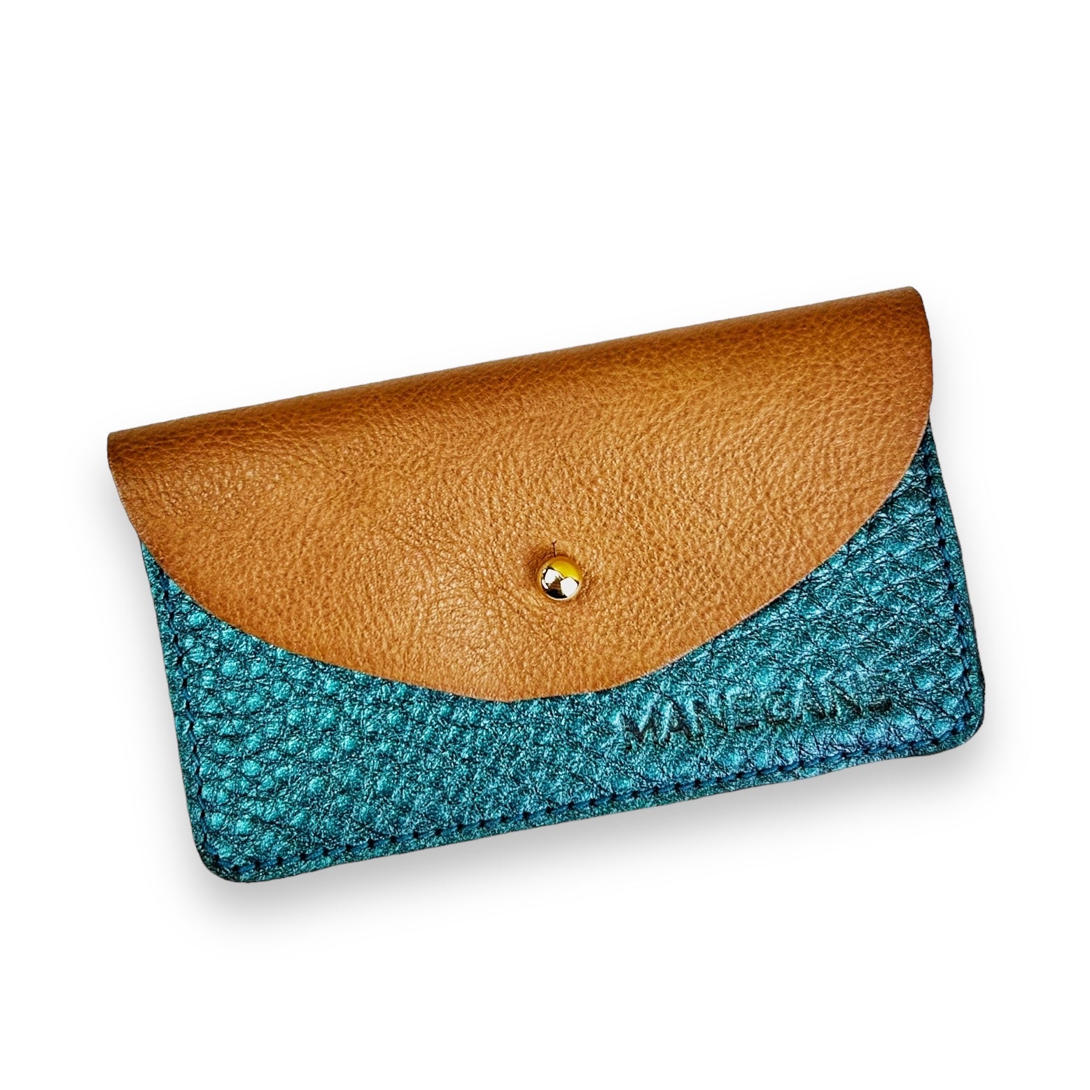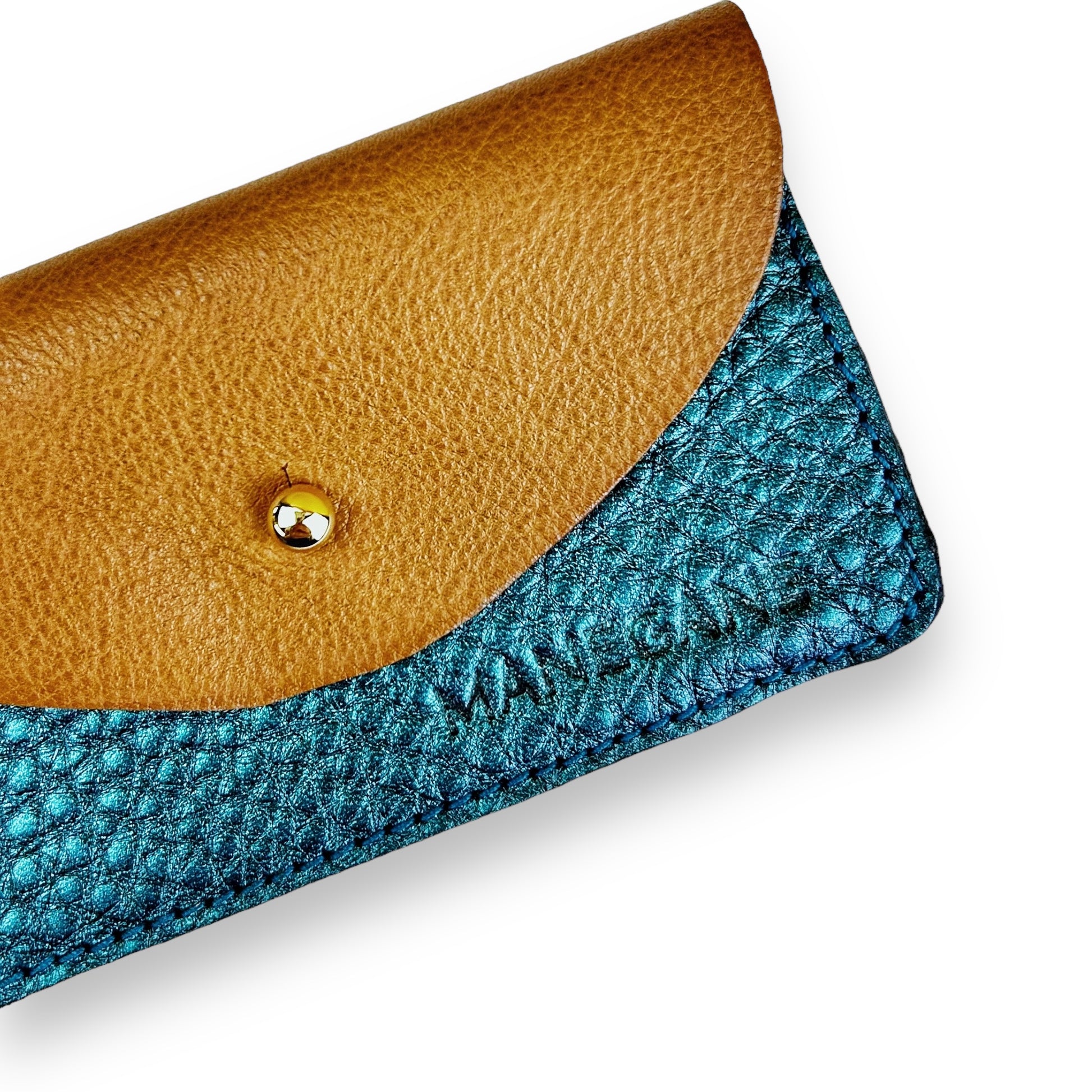 • Coloris bleu pétrole métallisé grainé aux reflets verts et violets, cuir craramel