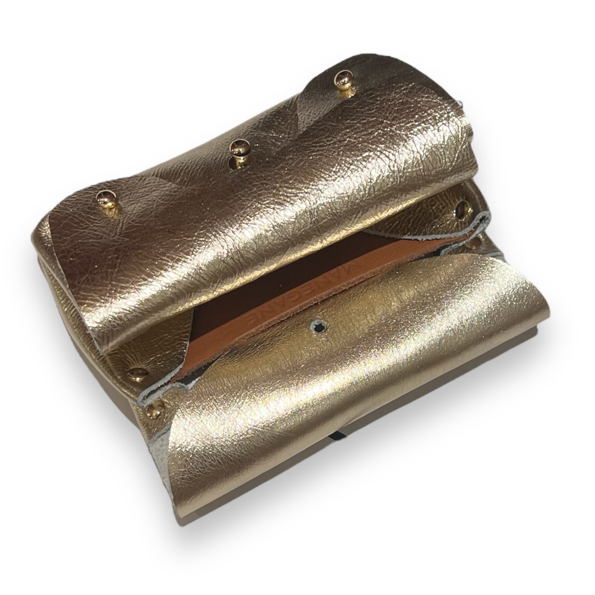 Maroquinerie française réalisé artisanalement à Biarritz, Manegane a pensé une gamme de porte-monnaie ultra pratique grâce à ses 5 compartiments dont le porte-monnaie en cuir doré Champagne, tout en étant raffiné avec ses 3 boutons de col.