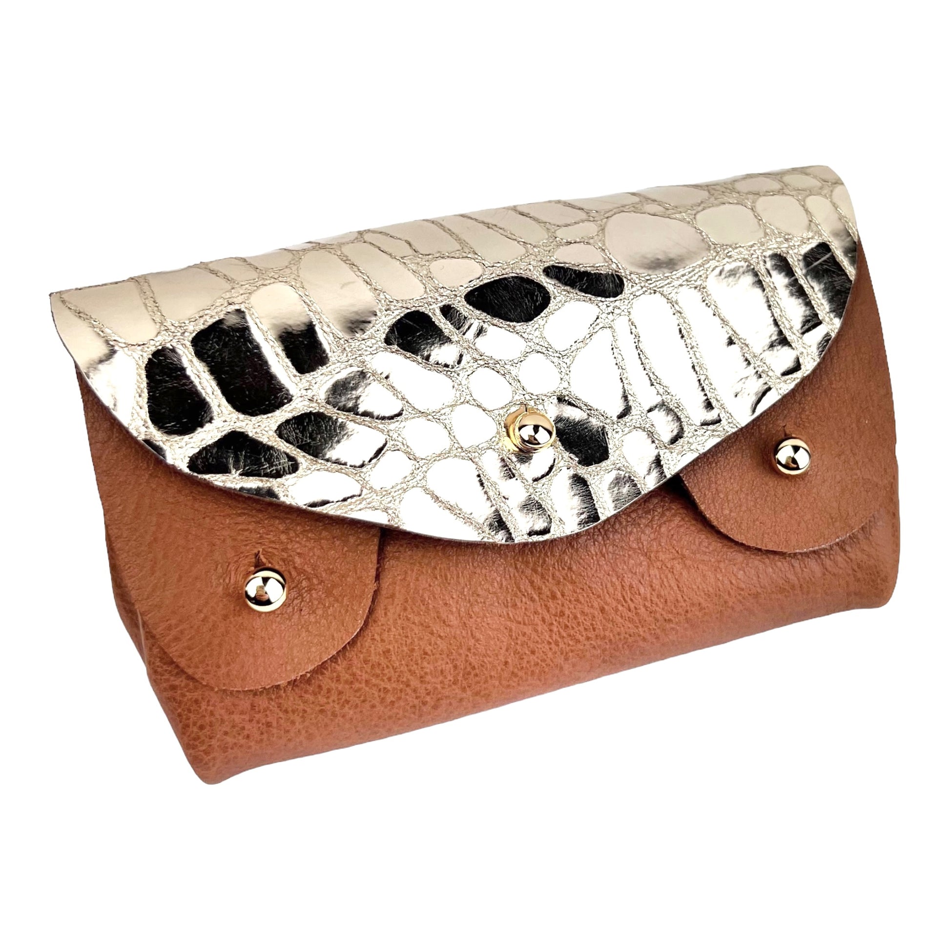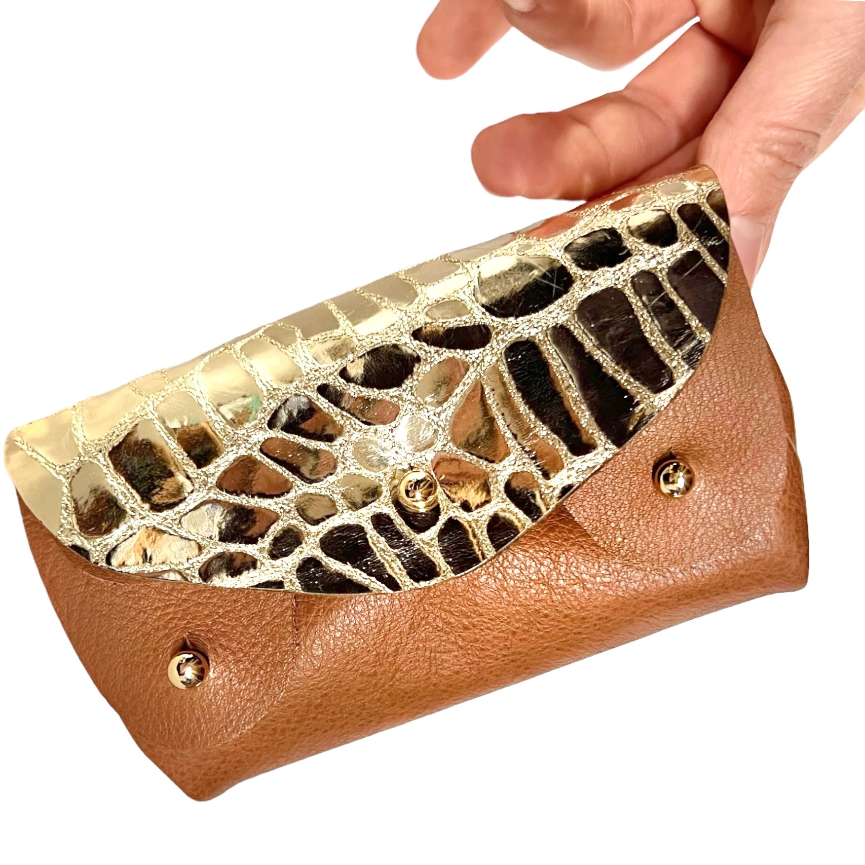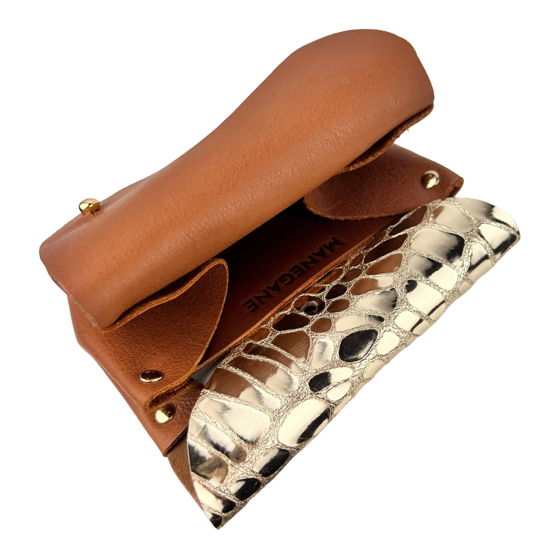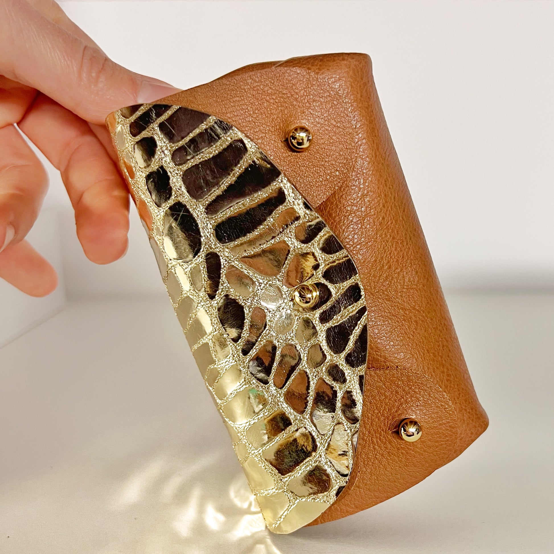 • Coloris doré clair effet miroir, et caramel, embossage effet croco
