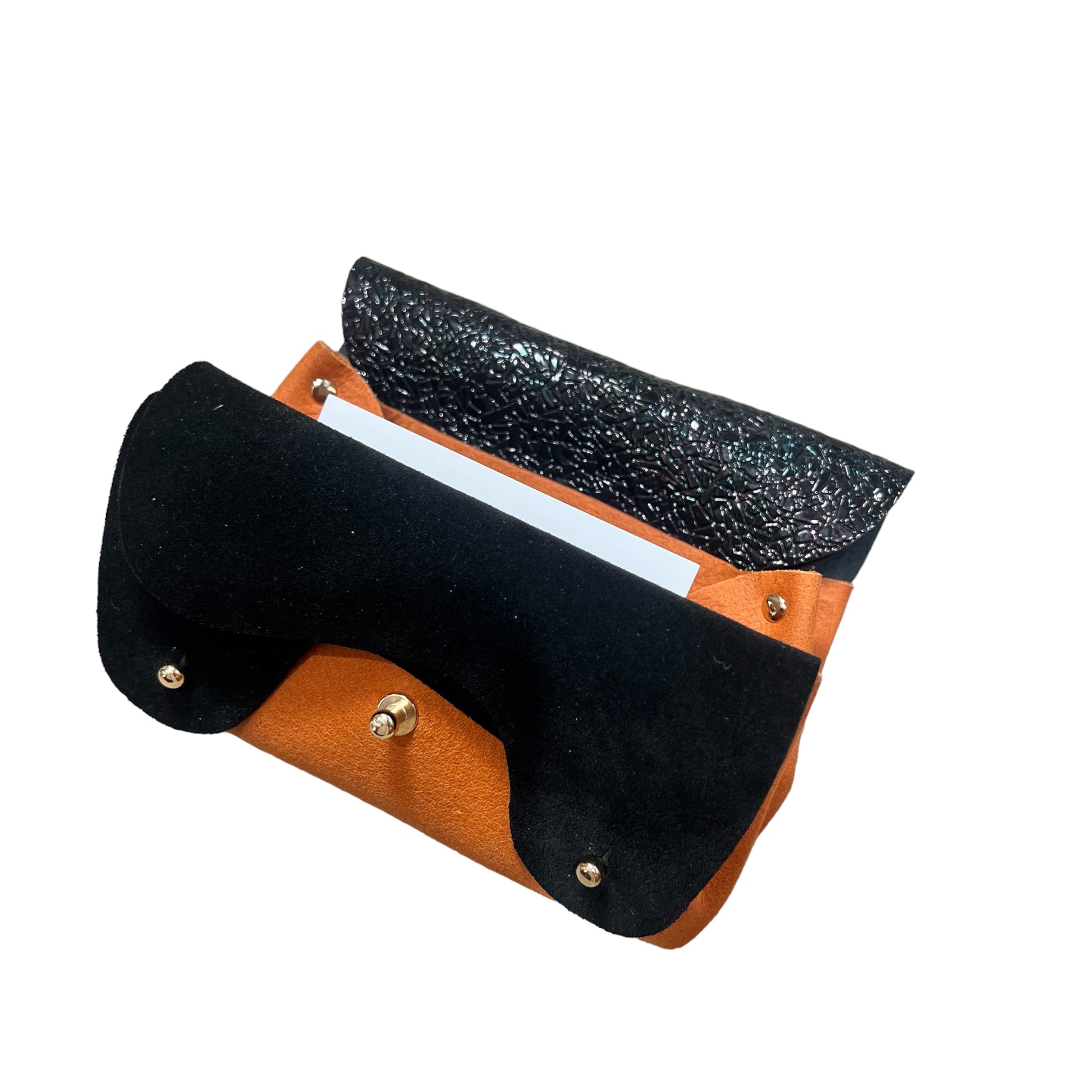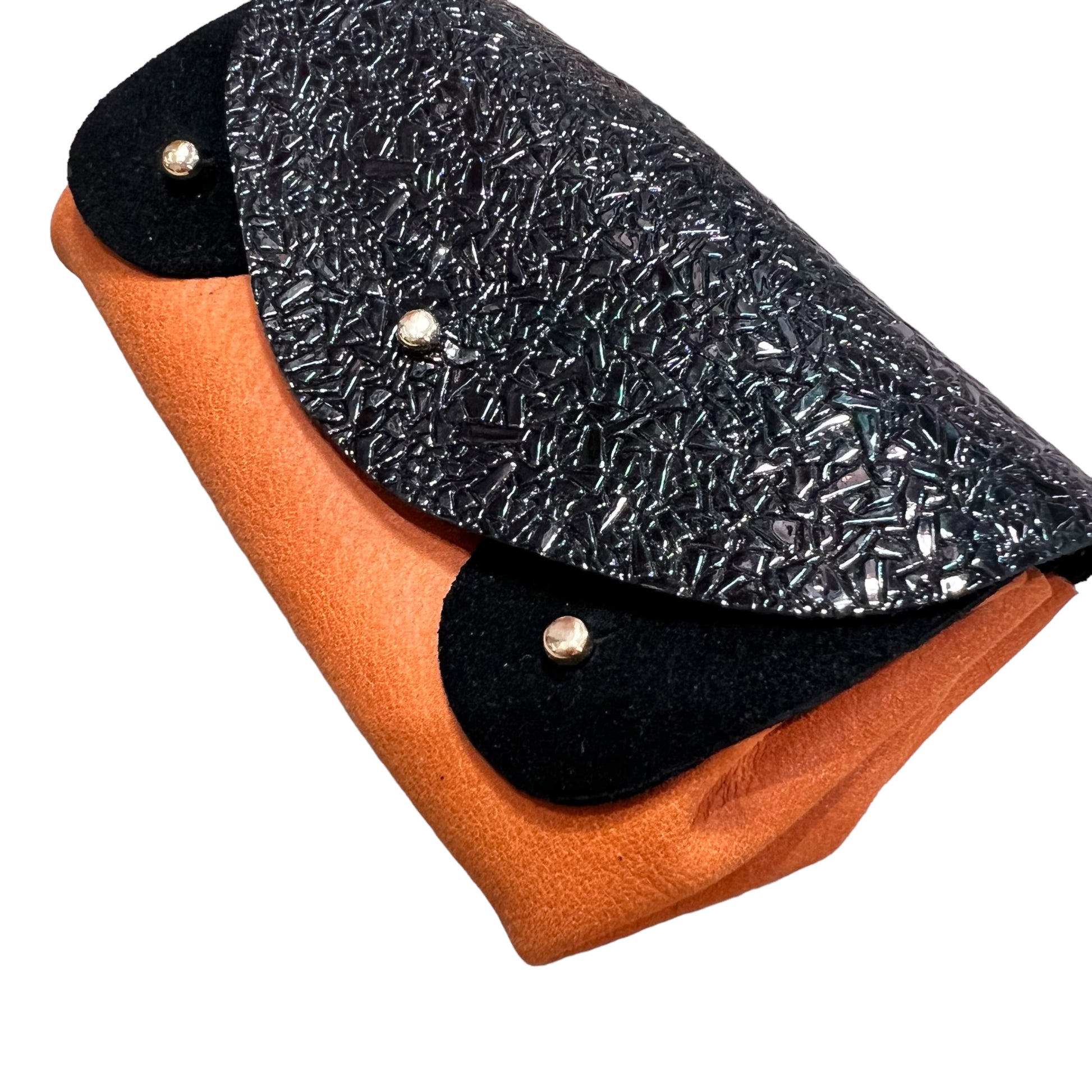 Portefeuille en cuir, trio de couleurs, teintes caramel et noirs bi matières